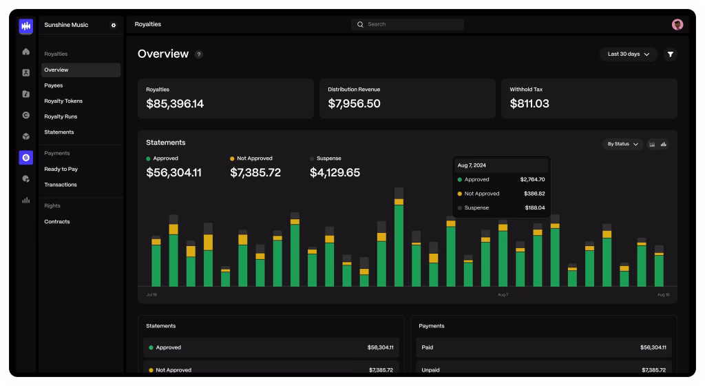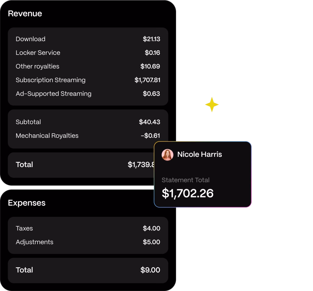 Unlock detailed insights into your royalties by DSPs, markets, and assets. Track every stream with pinpoint accuracy to ensure no revenue is left unaccounted for, enabling smarter decisions and optimized financial growth.